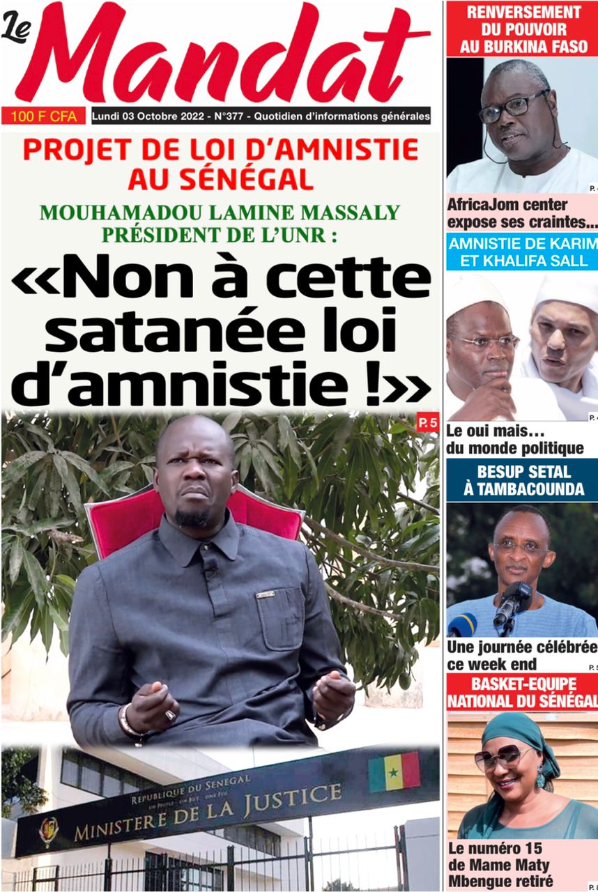 Une des journaux du lundi 3 octobre 2022 Auteur/autrice de la publication :LA REDACTION Publication publiée :3 octobre 2022 Commentaires de la publication :0 commentaire Une des journaux du lundi 3 octobre 2022Publicité Partager : Cliquez pour partager sur Facebook(ouvre dans une nouvelle fenêtre) Facebook Cliquer pour partager sur X(ouvre dans une nouvelle fenêtre) X Publicité A lire aussi : Une des journaux du jeudi 22 juin 2023 Étiquettes: lundi 3 octobre 2022, une des journaux Read more articles Article précédentUne des journaux du samedi 1er octobre 2022 Article suivantUne des journaux du mercredi 09 novembre 2022 Vous devriez également aimer Thiès : mise en place de la coordination départementale des conseillers municipaux : Les élus réclament la revalorisation de leur statut 4 mai 2024 Une des journaux du mardi 08 août 2023 8 août 2023 Une des journaux du jeudi 06 juillet 2023 6 juillet 2023 Une des journaux du mercredi 17 mai 2022 17 mai 2023 Laisser un commentaire Annuler la réponseCommentEnter your name or username to comment Enter your email address to comment Saisir l’URL de votre site (facultatif) Enregistrer mon nom, mon e-mail et mon site dans le navigateur pour mon prochain commentaire. Δ