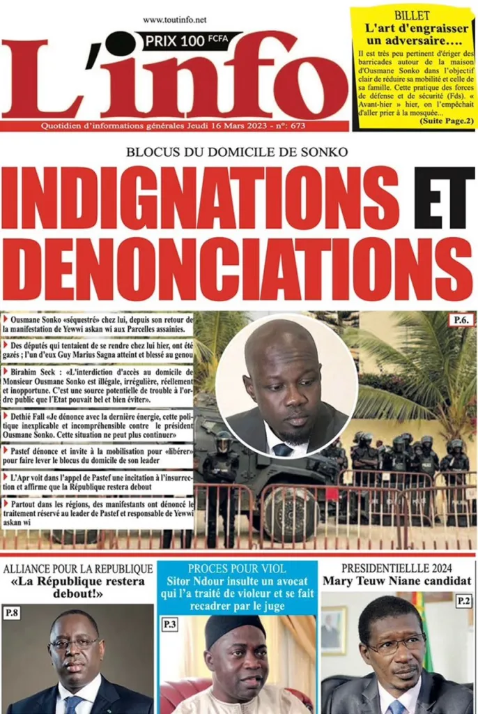 PUBLIC-UNES DE NOS QUOTIDIENS NATIONAUX,CE JEUDI 16 MARS 2023 Auteur/autrice de la publication :LA REDACTION Publication publiée :16 mars 2023 Commentaires de la publication :0 commentaire Partager : Cliquez pour partager sur Facebook(ouvre dans une nouvelle fenêtre) Facebook Cliquer pour partager sur X(ouvre dans une nouvelle fenêtre) X Publicité Vous devriez également aimer Après près d’une heure au bureau du doyen des juges, Adji reconnait l’authenticité des audios, mais… 22 décembre 2022 Un corps sans vie repêché dans les cotes de Saint louis: la famille de l’agent Didier Badji convoquée pour identification… 9 décembre 2022 L’Espagne a un nouveau sélectionneur ! 8 décembre 2022 Journée sans presse, boycott des activités gouvernementales : La CAP menace… 7 décembre 2022 CM : Les Lions vont recevoir leurs primes de qualification pour les quarts de finale 7 décembre 2022 Pape Alé Niang face au juge du 2ème cabinet vendredi. 5 décembre 2022 Angleterre vs Sénégal: la déception des supporters 4 décembre 2022 Assemblée Nationale: le désespoir des Sénégalais 4 décembre 2022 Nemmeku Tour à Joal : Sonko et ses camarades gazés par la gendarmerie. 17 octobre 2022 Pikine : Le marché au poisson a un nouveau directeur. 15 novembre 2022 Fièvre Crimée-Congo: un cas de décès à Foundiougne 21 août 2023 Burkina Fasso : Tentative de coup d’état, le président Paul H. Damiba serait sur le point de démissionner. 30 septembre 2022 Rapport de la cour des comptes : Les convocations de la DIC commenceront cette semaine 8 février 2023 Laisser un commentaire Annuler la réponseCommentEnter your name or username to comment Enter your email address to comment Saisir l’URL de votre site (facultatif) Enregistrer mon nom, mon e-mail et mon site dans le navigateur pour mon prochain commentaire. Δ
