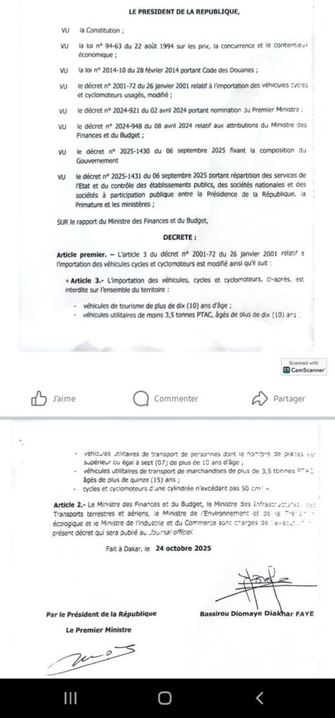 Selon le gouvernement, cette réforme vise à trouver un équilibre entre le renouvellement du parc automobile national, la protection de l’environnement et les besoins économiques des Sénégalais de l’extérieur. Le décret sera publié prochainement au Journal officiel.